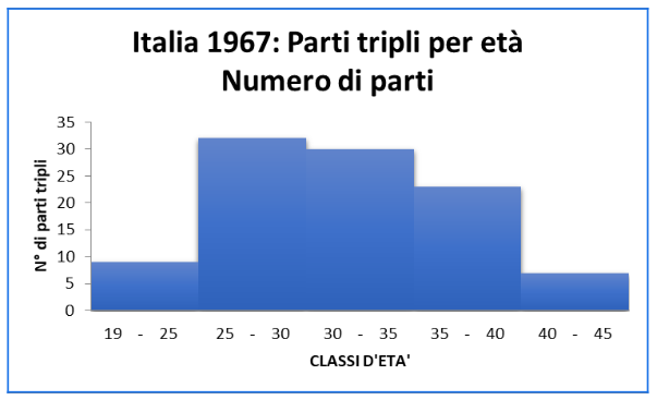 L’istogramma invece è una rappresentazione grafica di una variabile che sia caratterizzata, in particolare, da modalità continue. L’istogramma si redige considerando il fenomeno e l’ampiezza delle classi (in quanto normalmente, in questi casi, le modalità sono raggruppate in classi). Dato che dovrebbe essere usato solo per modalità continue, ogni rettangolo va unito a quello vicino. Sarebbe meglio se le classi fossero della medesima ampiezza (cioè equiampie) per poter così rappresentare sull’asse y la frequenza del fenomeno. Che è quello che il lettore si aspetta sia riportato nel grafico. Nel grafico qui a fianco (che rappresenta dati veri) il problema è rappresentato dalla prima classe (che non è ampia esattamente quanto le altre; inoltre è attaccata all’asse y, ma non parte da zero e quindi andrebbe staccata).